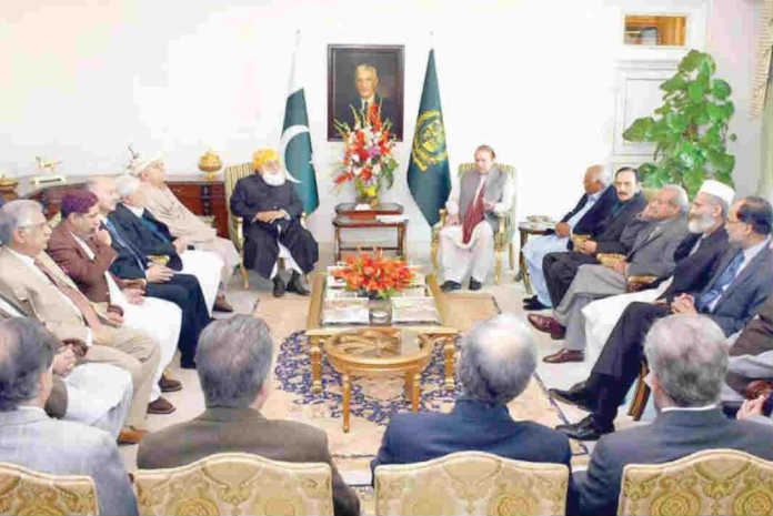 The meeting was attended by Ahsan Iqbal, Information Minister Senator Pervaiz Rasheed, Special Assistant to PM on Foreign Affairs Tariq Fatemi, Pervaiz Khattak, JUI-F chief Maulana Fazl-ur-Rehman, Jamat-e-Islami chief Siraj-ul-Haq, KP Governor Mahtab Abbasi, Senator Mushaid Hussain Syed, PML-leader Zafar Iqbal Jhagra, Pakistan Peoples Party’s Senator Itazaz Ahsan, Awami Nation Party’s Mian Iftikhar Hussain, Pakistan Tehreek-e-Insaf’s Shah Mahmood Qureshi and others.